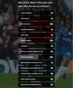 Manchester United menang 1-0 di Stamford Bridge. Gol kemenangan dicetak oleh Matheus Cunha setelah menerima umpan matang dari Bruno.