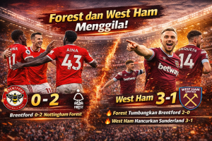 Nottingham Forest juga mencuri perhatian dengan kemenangan 2-0 di markas Brentford, sementara West Ham United melanjutkan kebangkitan mereka dengan menghajar Sunderland 3-1 di London Stadium.